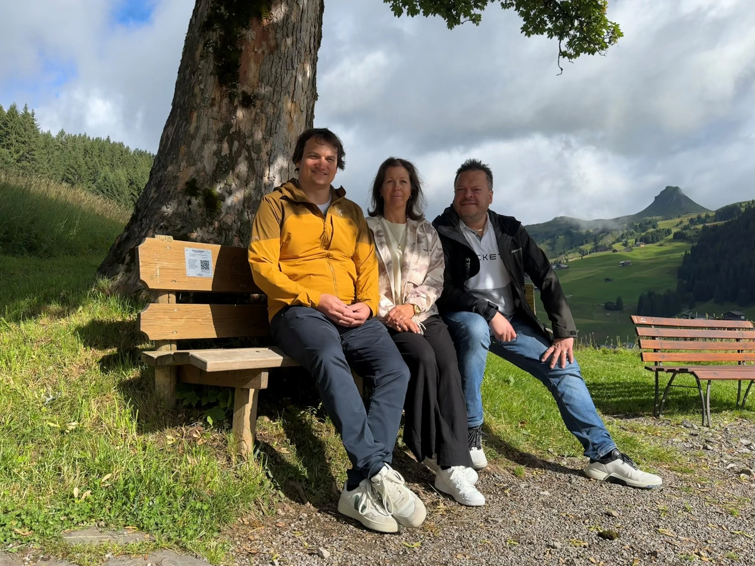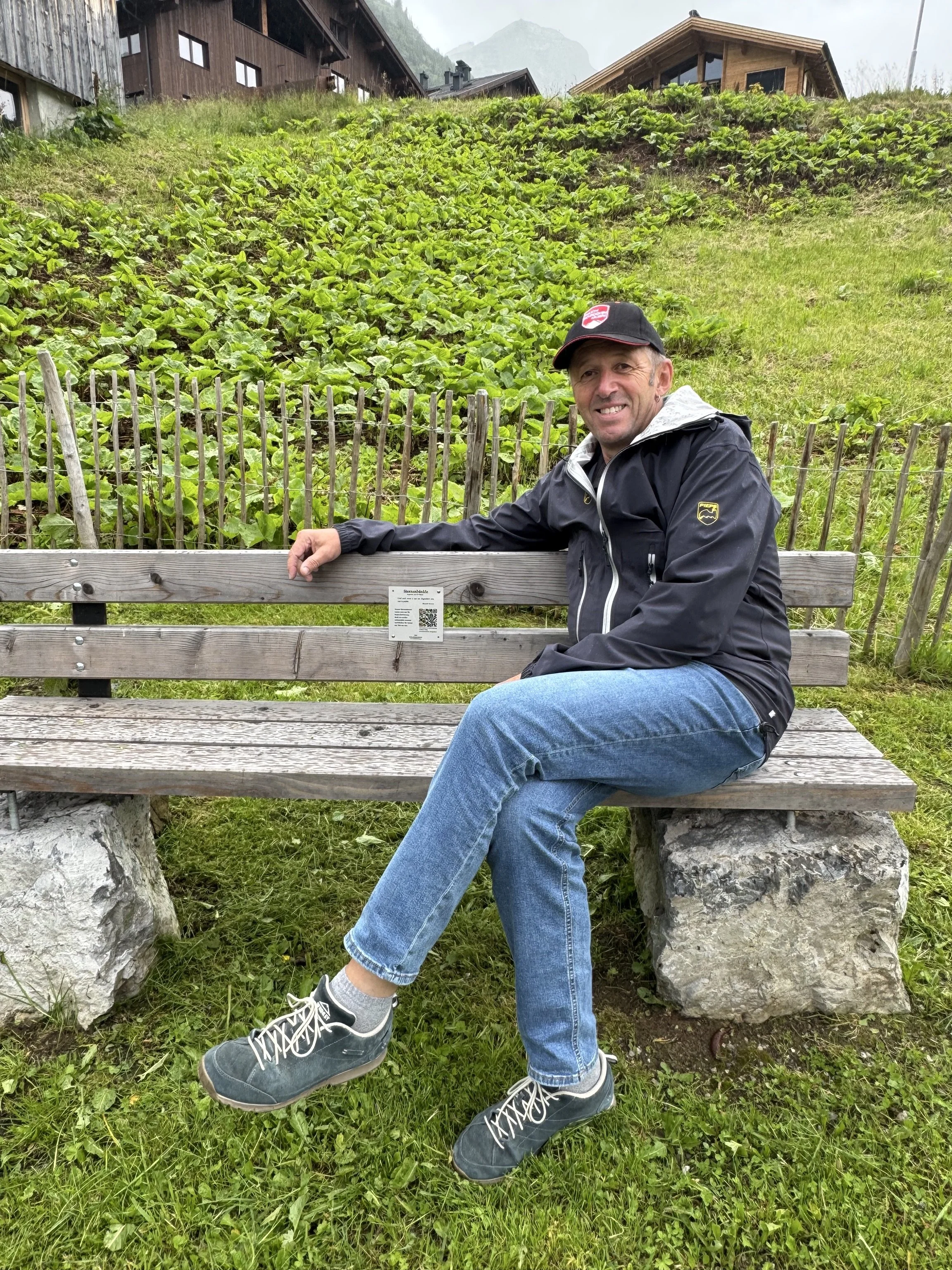 Das Bänkle steht unter dem Ahorn neben der Kirche in Damüls, Gemeindevorstand: Stefan Kohler (Gemeinderat), Sonja Klocker (Vizebürgermeisterin), Stefan Bischof, Bürgermeister Damüls: „Manche Menschen haben die Erde nur kurz berührt, doch sie hinterlassen Spuren in unseren Herzen – für immer.“